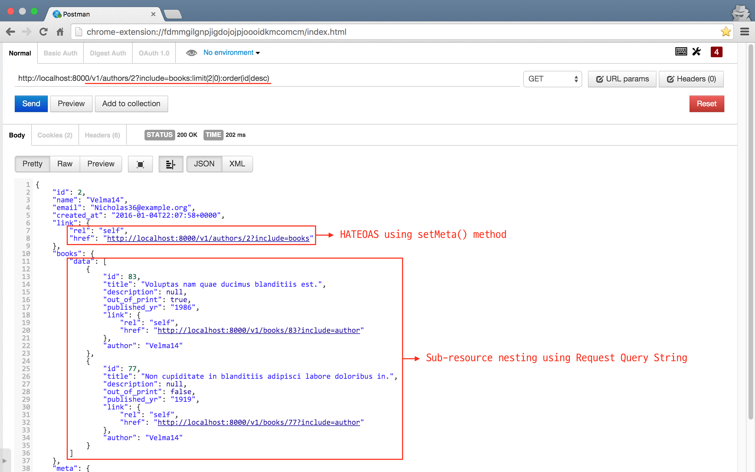 Head on to GET /v1/books, and you should see a well formatted json response. Try each route to get accustomed to, such as /v1/books=include=authors, /v1/authors=include=books:limit(2|0):order(id|desc).