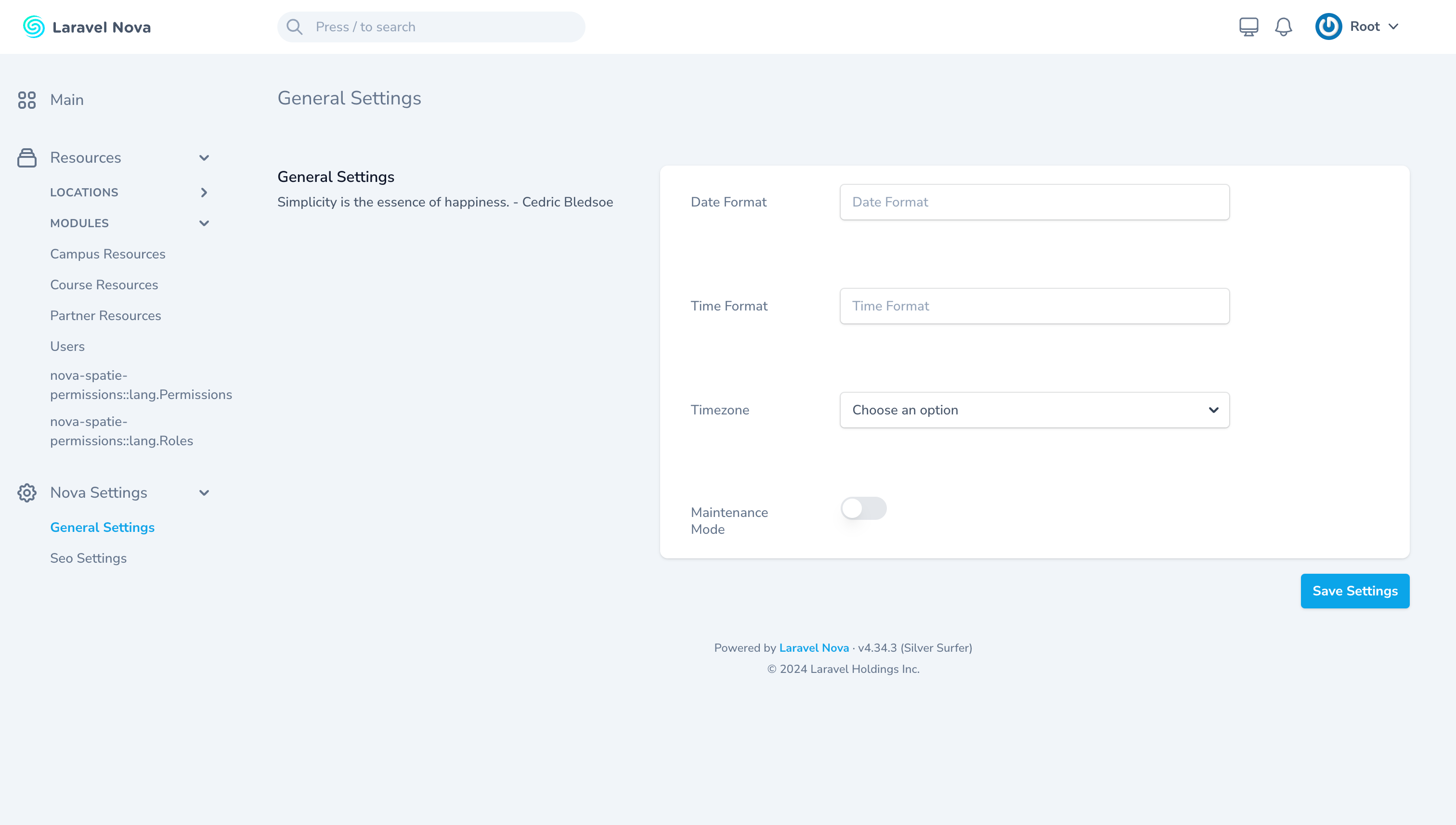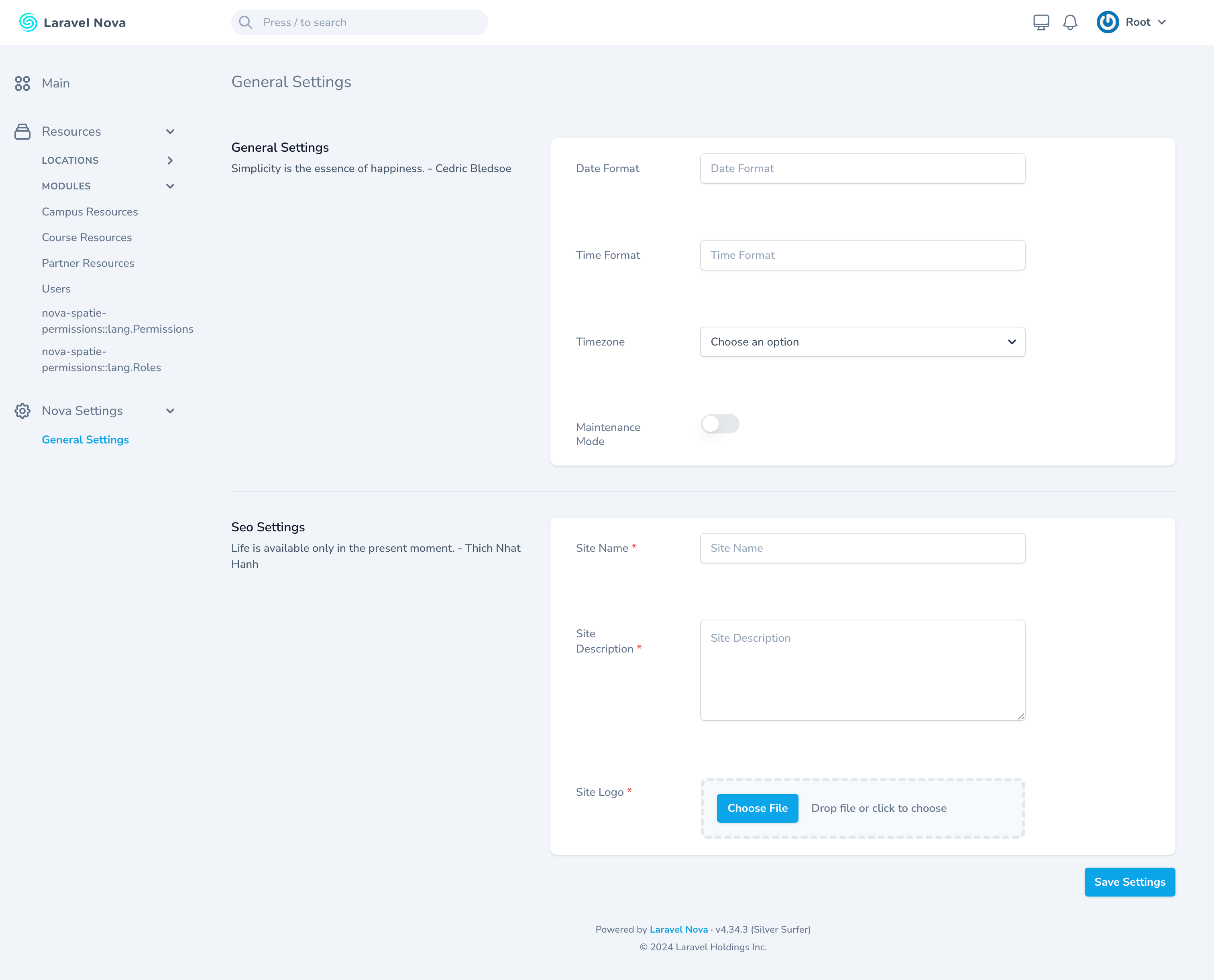 Nova Settings is a Laravel Nova package that provides an intuitive interface for managing settings using Spatie's settings package.