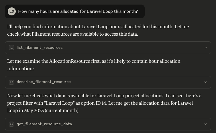The Laravel Loop Filament MCP Server is an extension for Laravel Loop that exposes your Filament Resources as an MCP server. This allows AI assistants and MCP clients to interact with your Filament Resources for data listing, querying, and (optionally) actions.