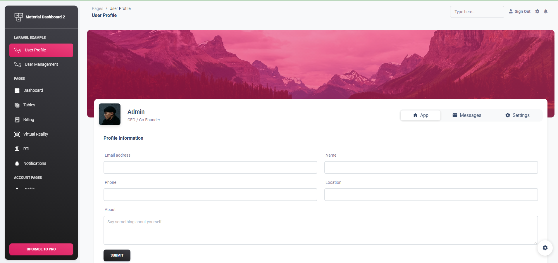 Besides the dashboard, the auth pages, the billing and table pages, there is also has an edit profile page. All the necessary files are installed out of the box and all the needed routes are added to routes/web.php. Keep in mind that all of the features can be viewed once you login using the credentials provided or by registering your own user.