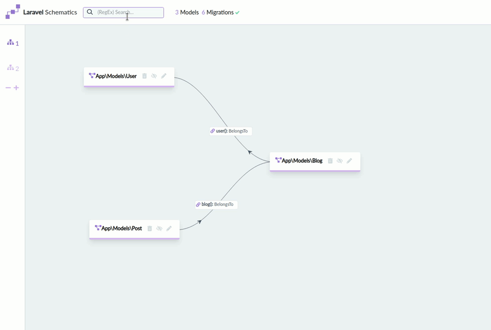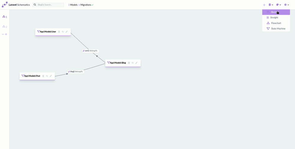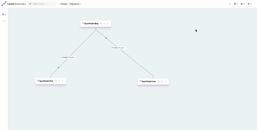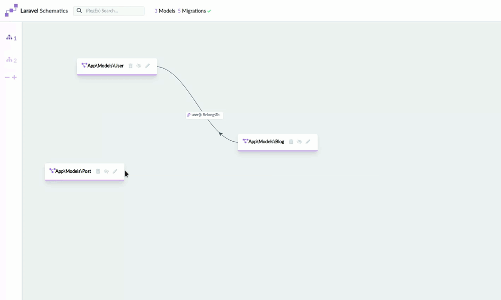 This package allows you to make multiple diagrams of your Eloquent models and their relations. It will help building them providing drag and drop relations, forms to create and edit your models and many options like adding resource controllers, form requests and running migrations by the click of a button or (configurable) automatically. It also will give you insights in the migrations you ran and the ones specified in your migrations folder.
